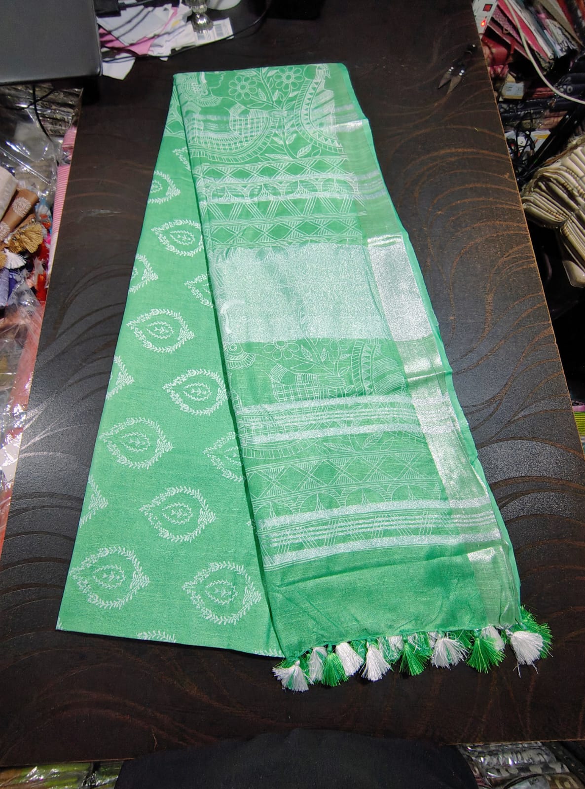 Handcrafted Manjusha Painting Saree – Off-White Base with Folk Dance Motifs | Bihar Traditional Art