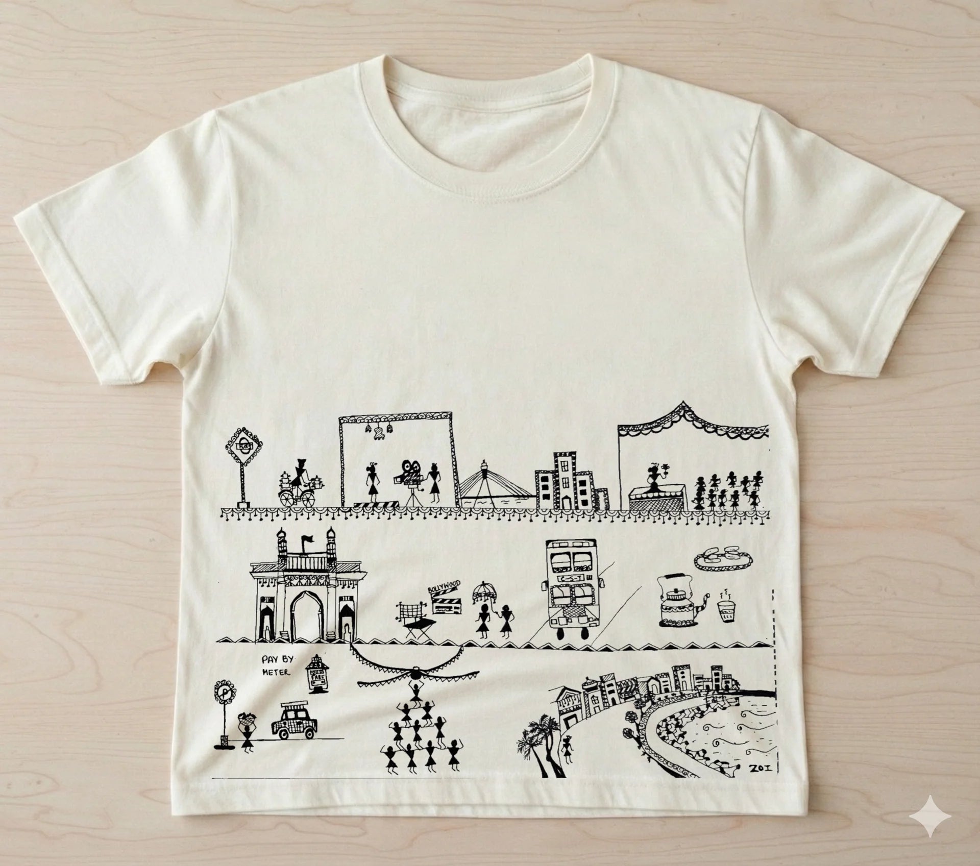 605 Handcrafted Bastar-Inspired Art T-Shirt – Mumbai City Storytelling Design on Premium Cotton | Unique Ethnic Wear